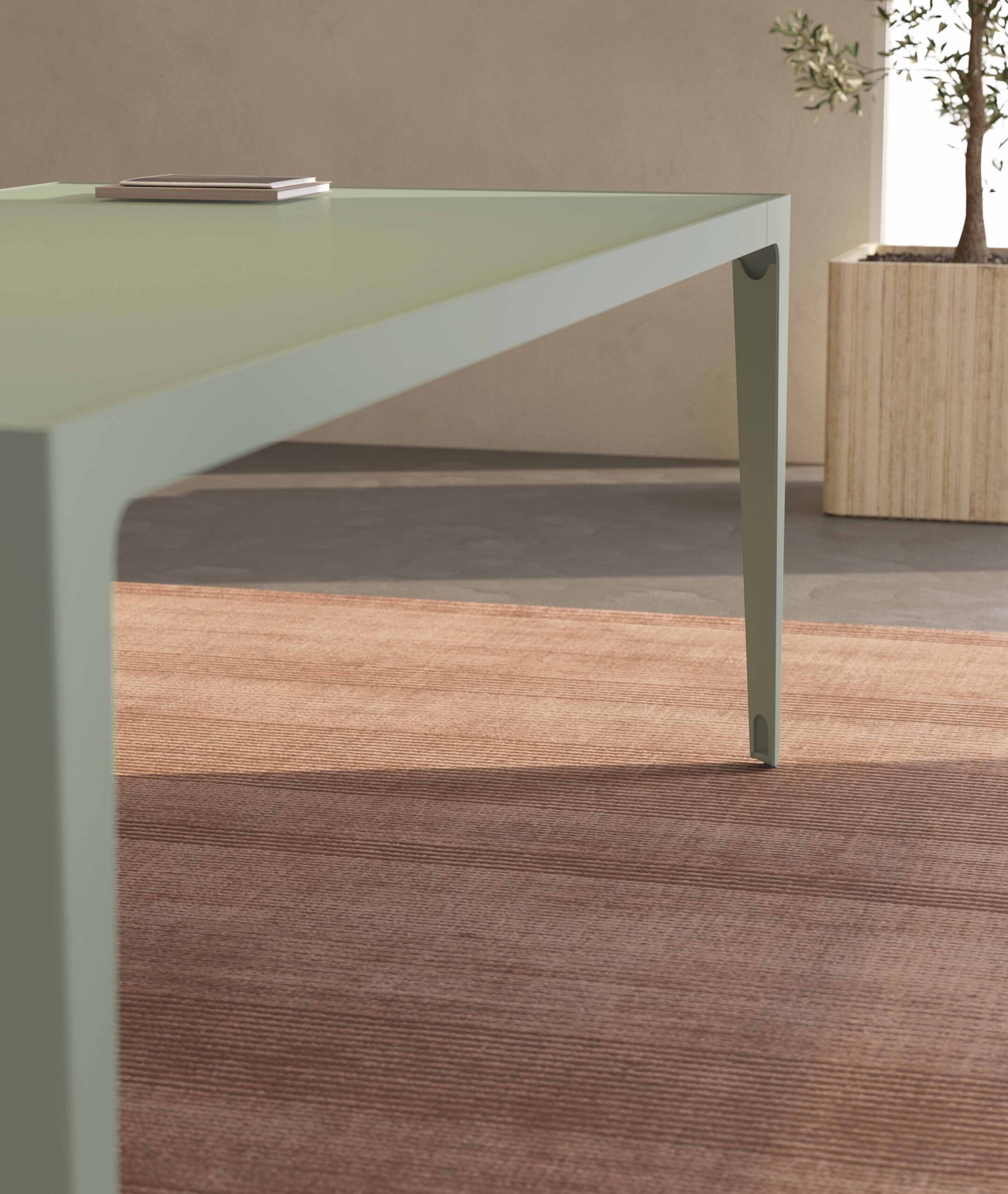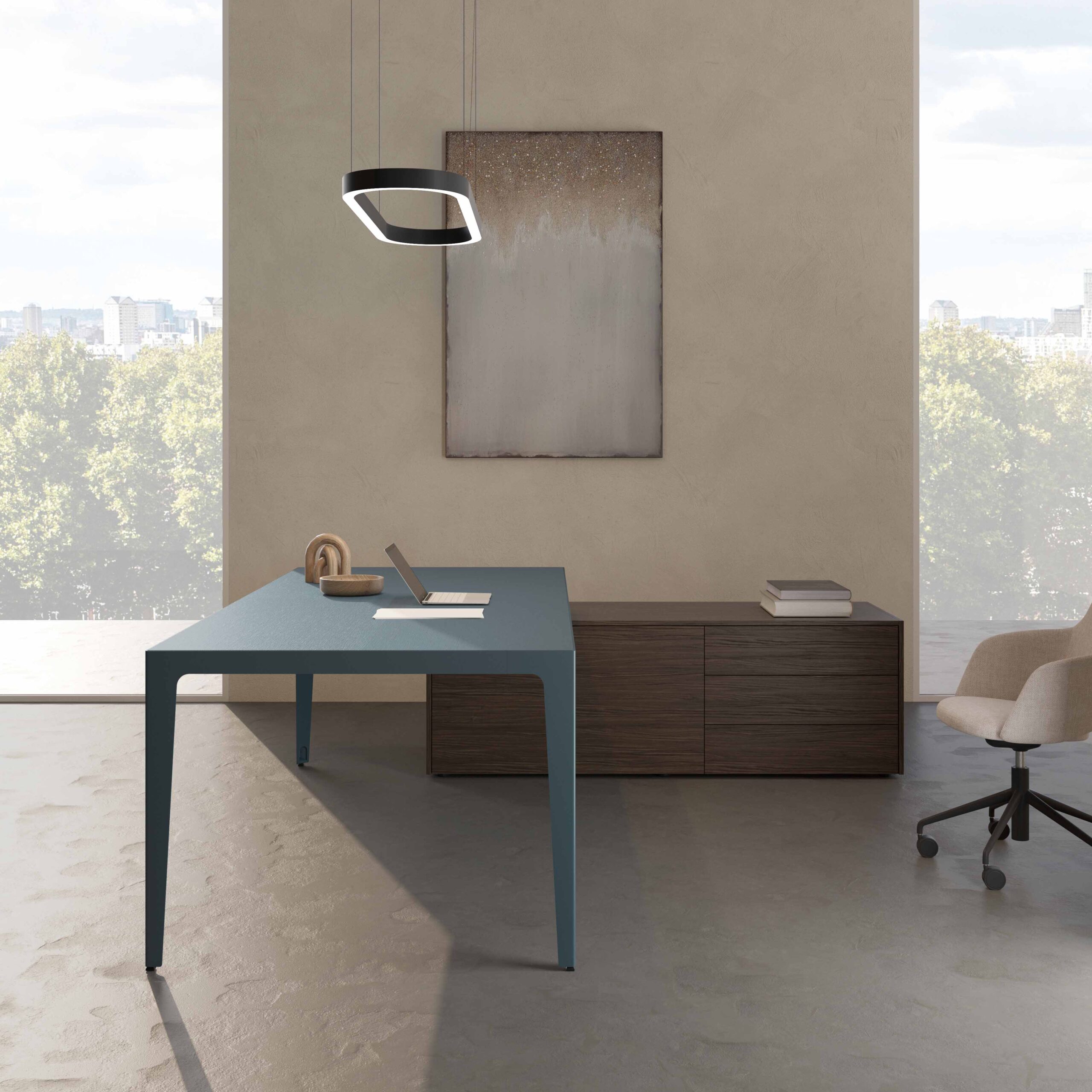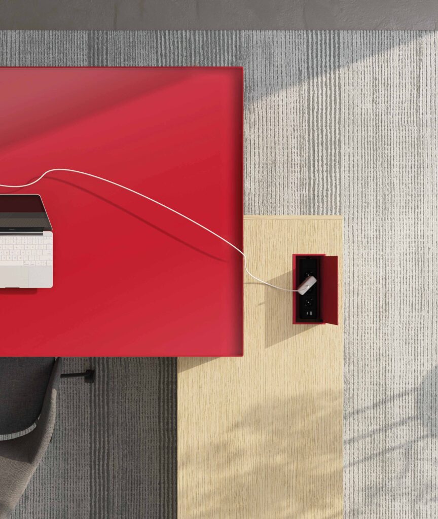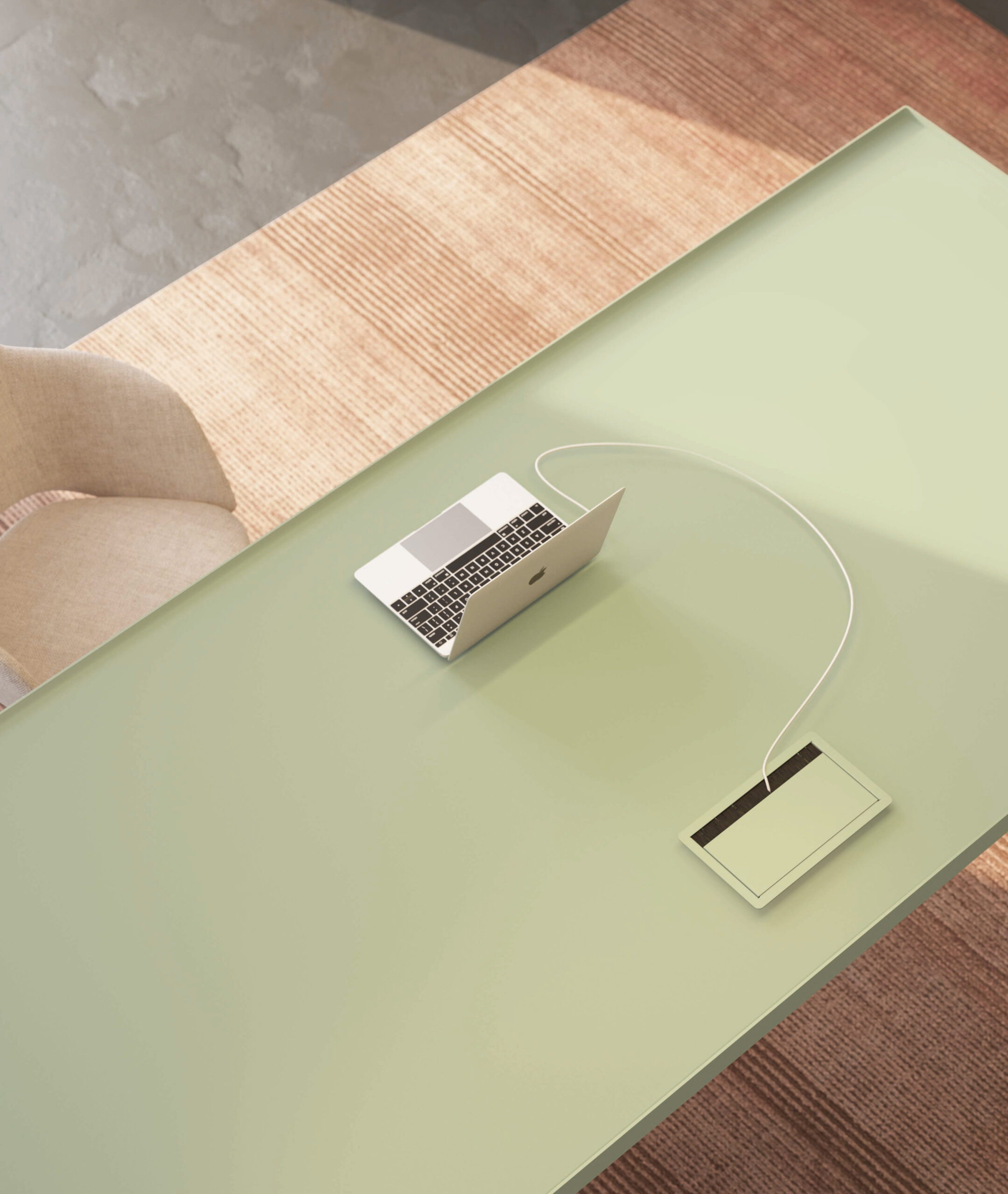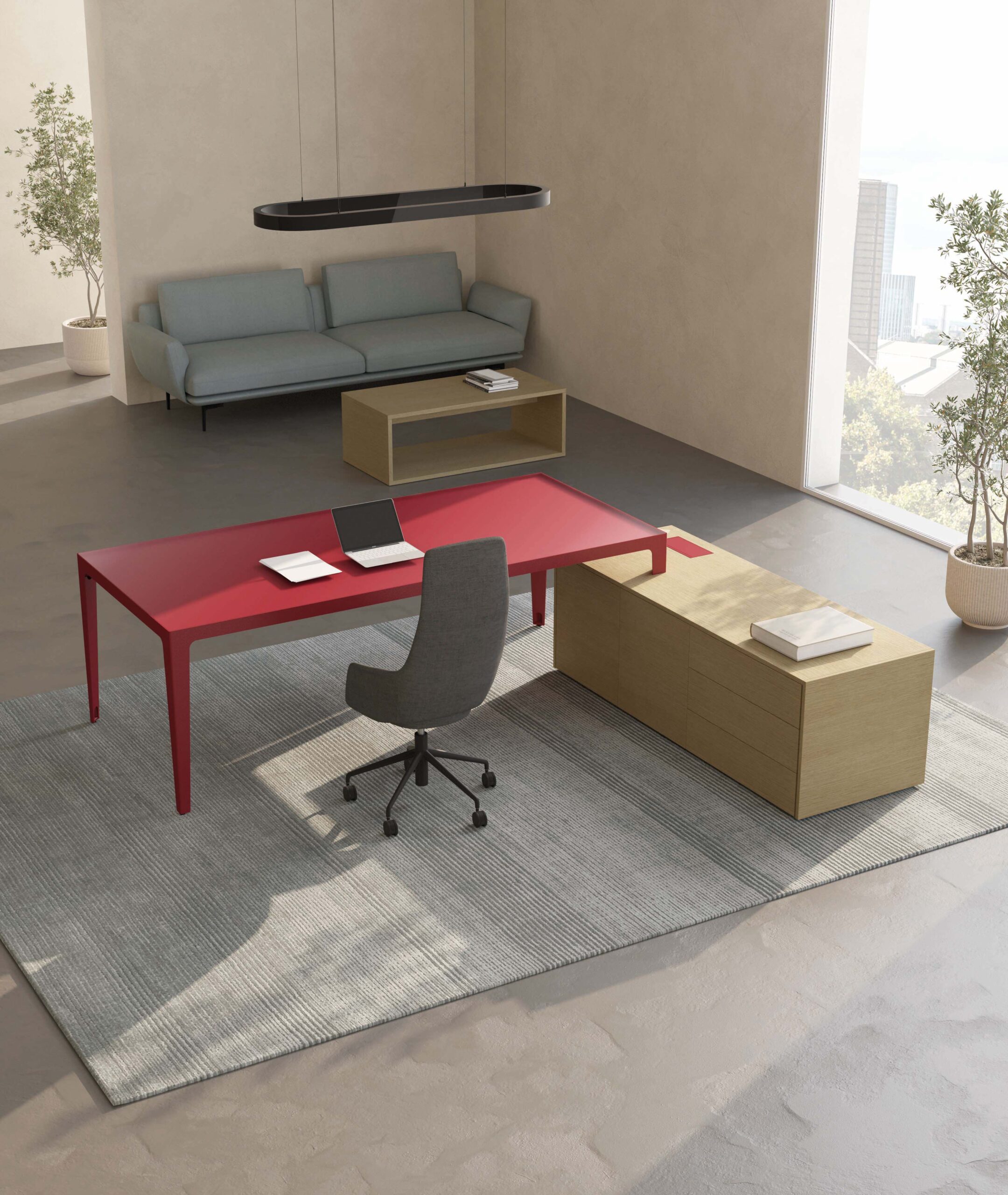 Modern and minimalist collection with flush-recessed top; glass, wood and gres combined with the coloured structures give energy to the working environment.