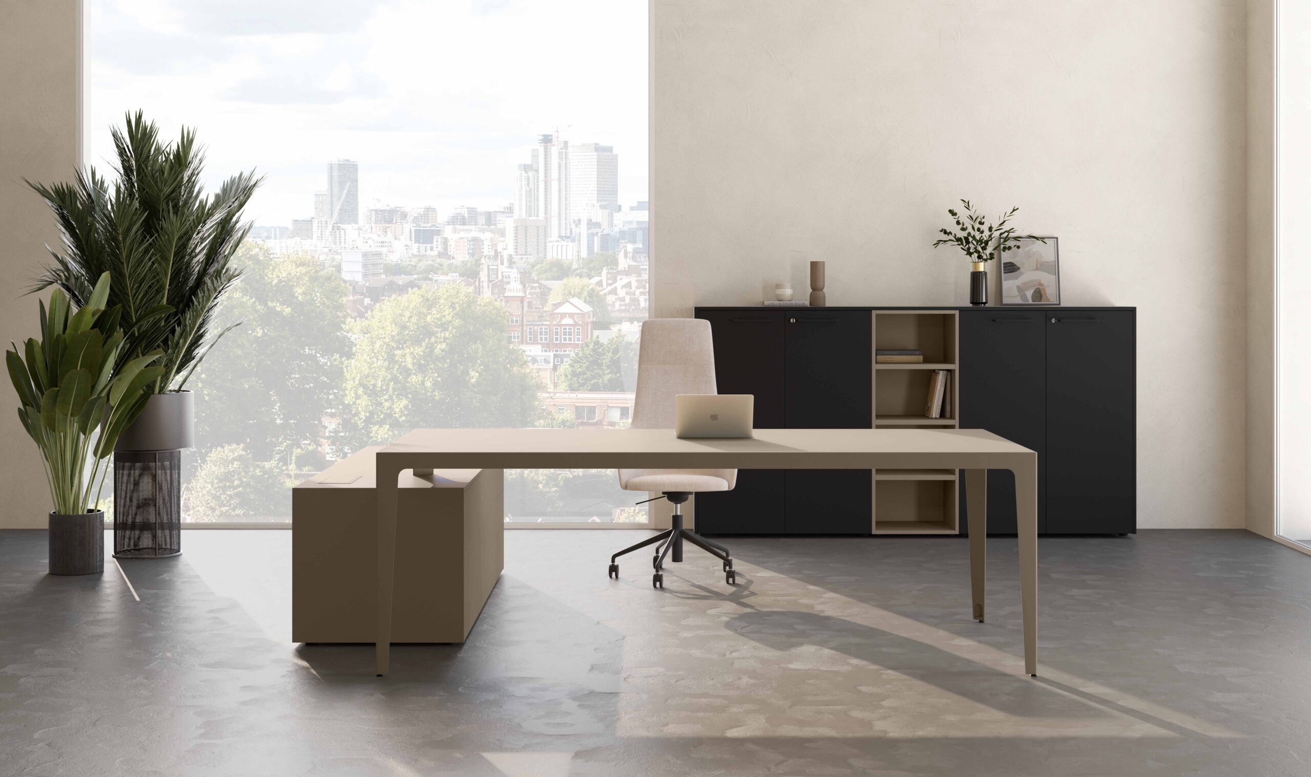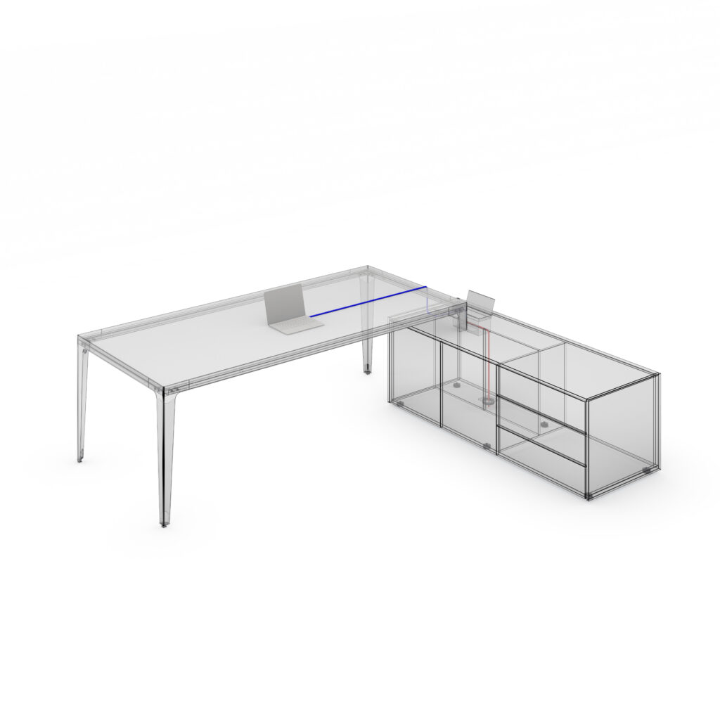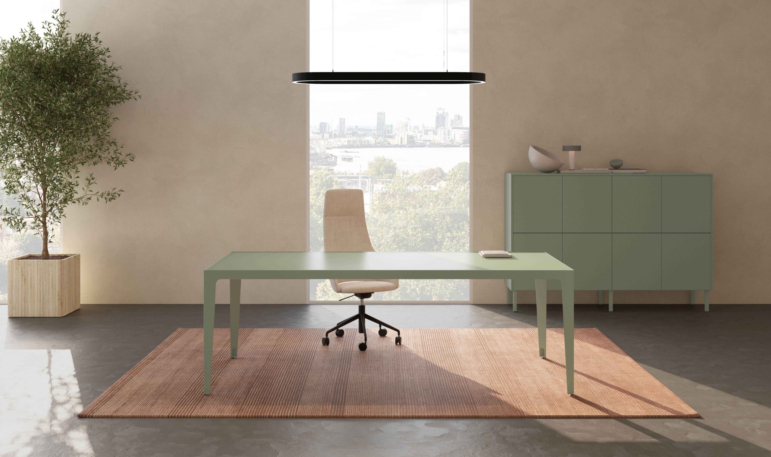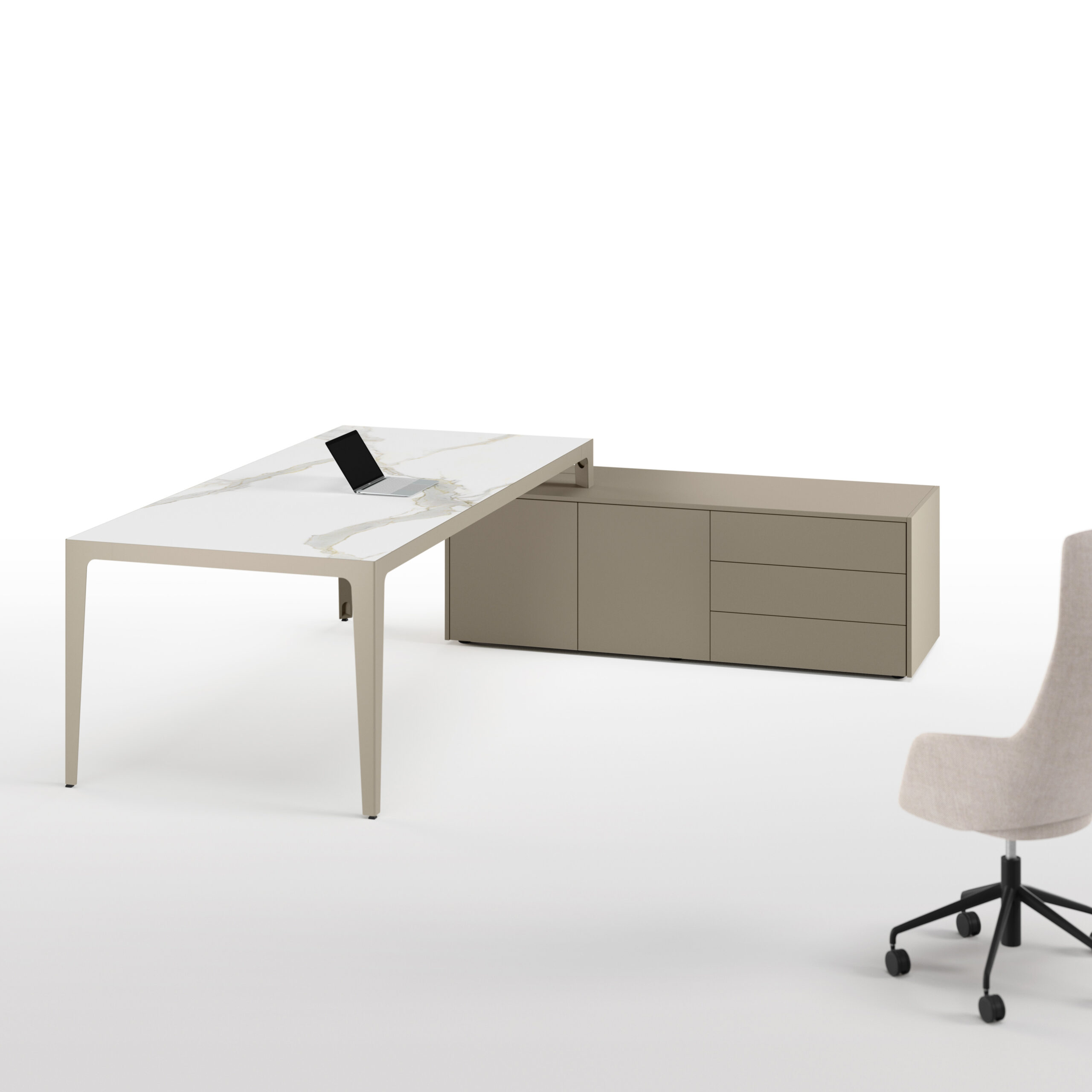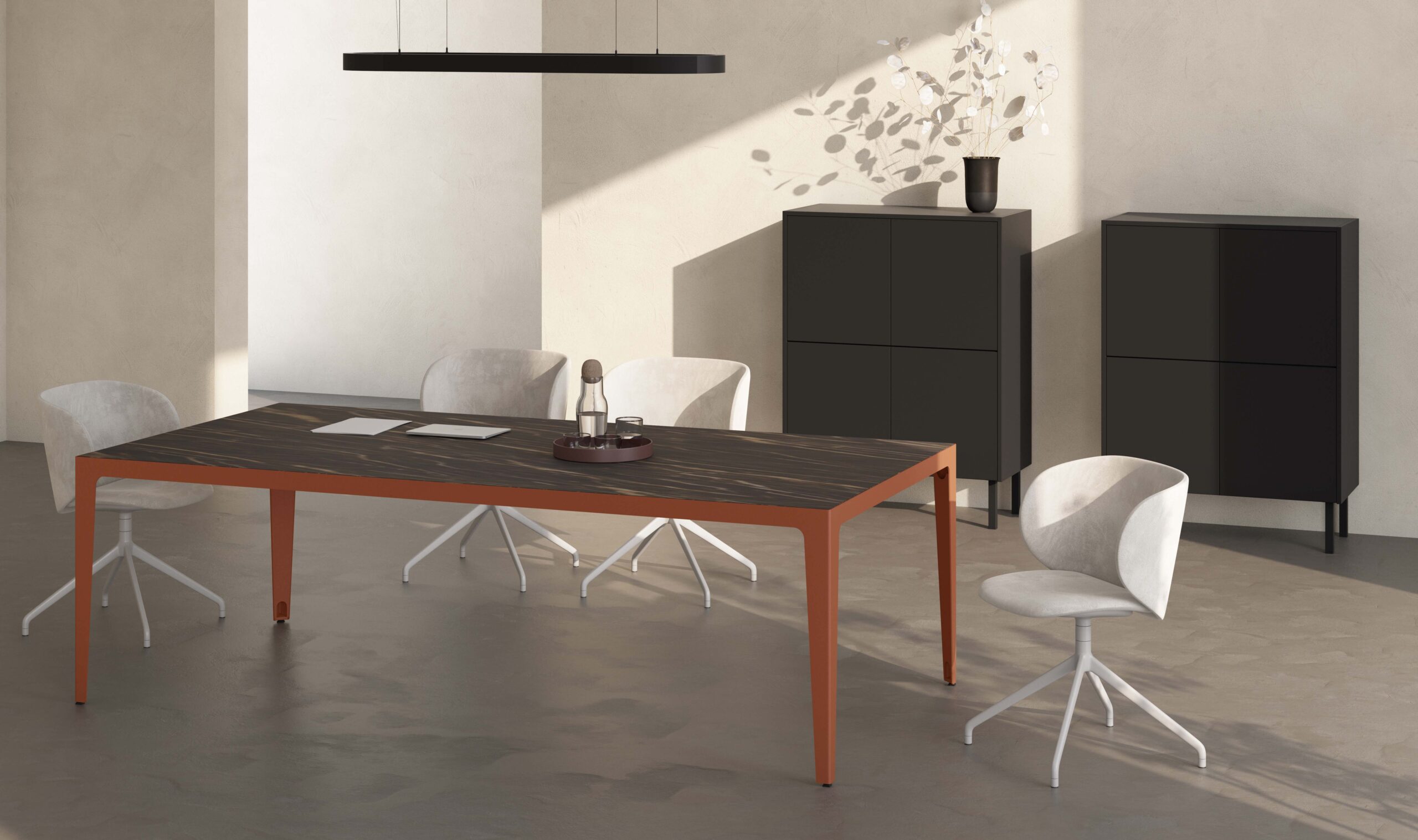 Modern and minimalist collection with flush-recessed top; glass, wood and gres combined with the coloured structures give energy to the working environment.