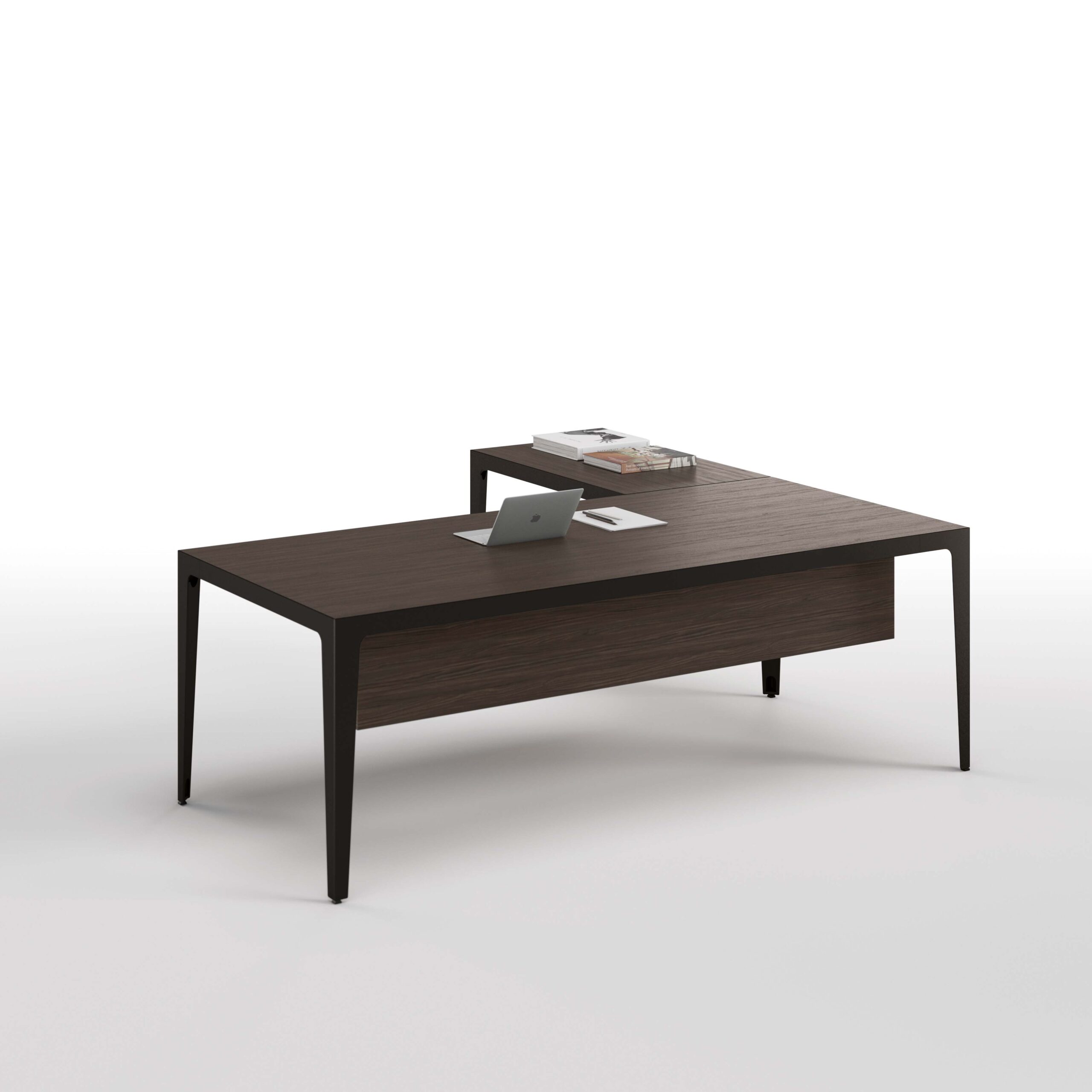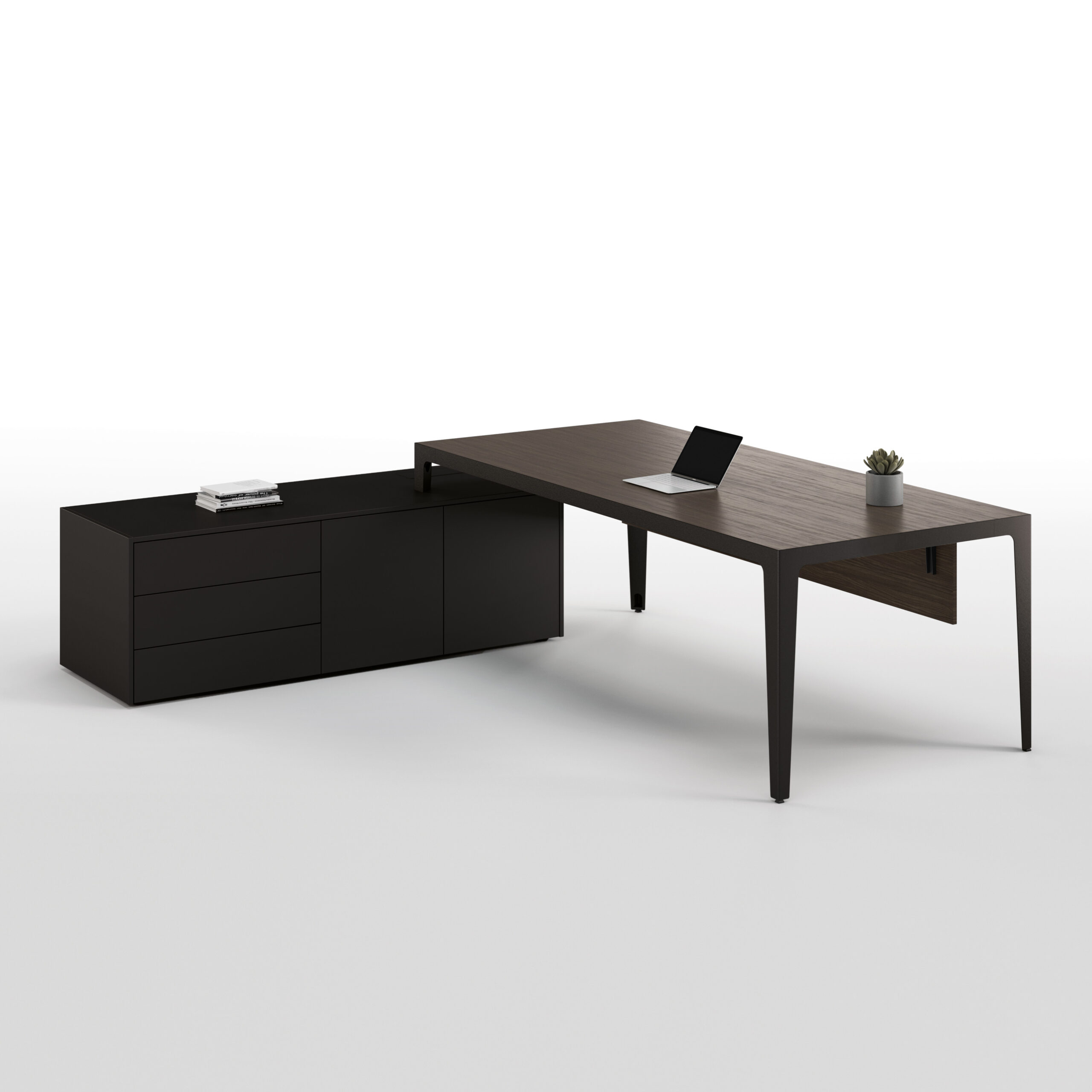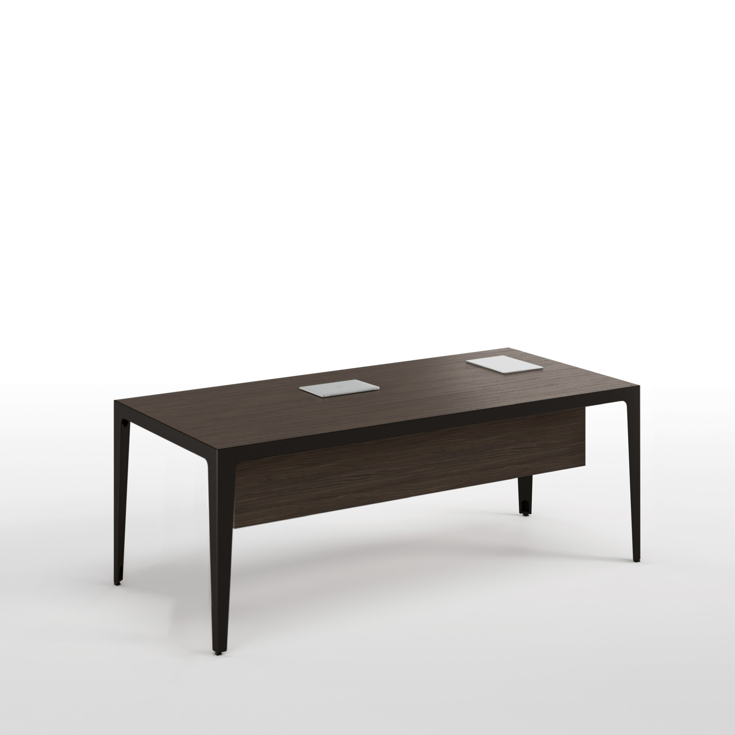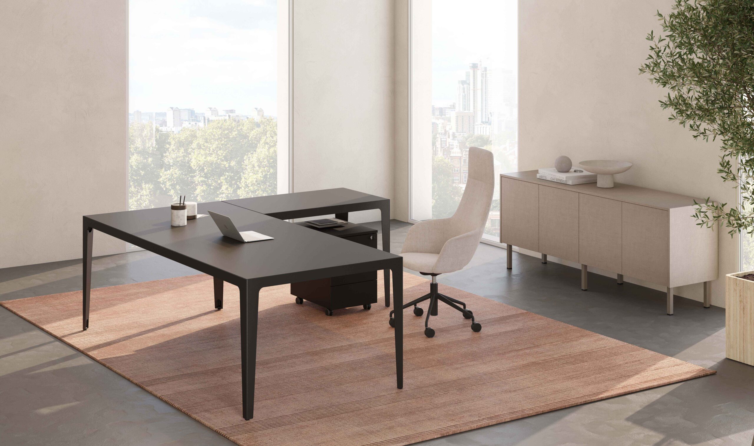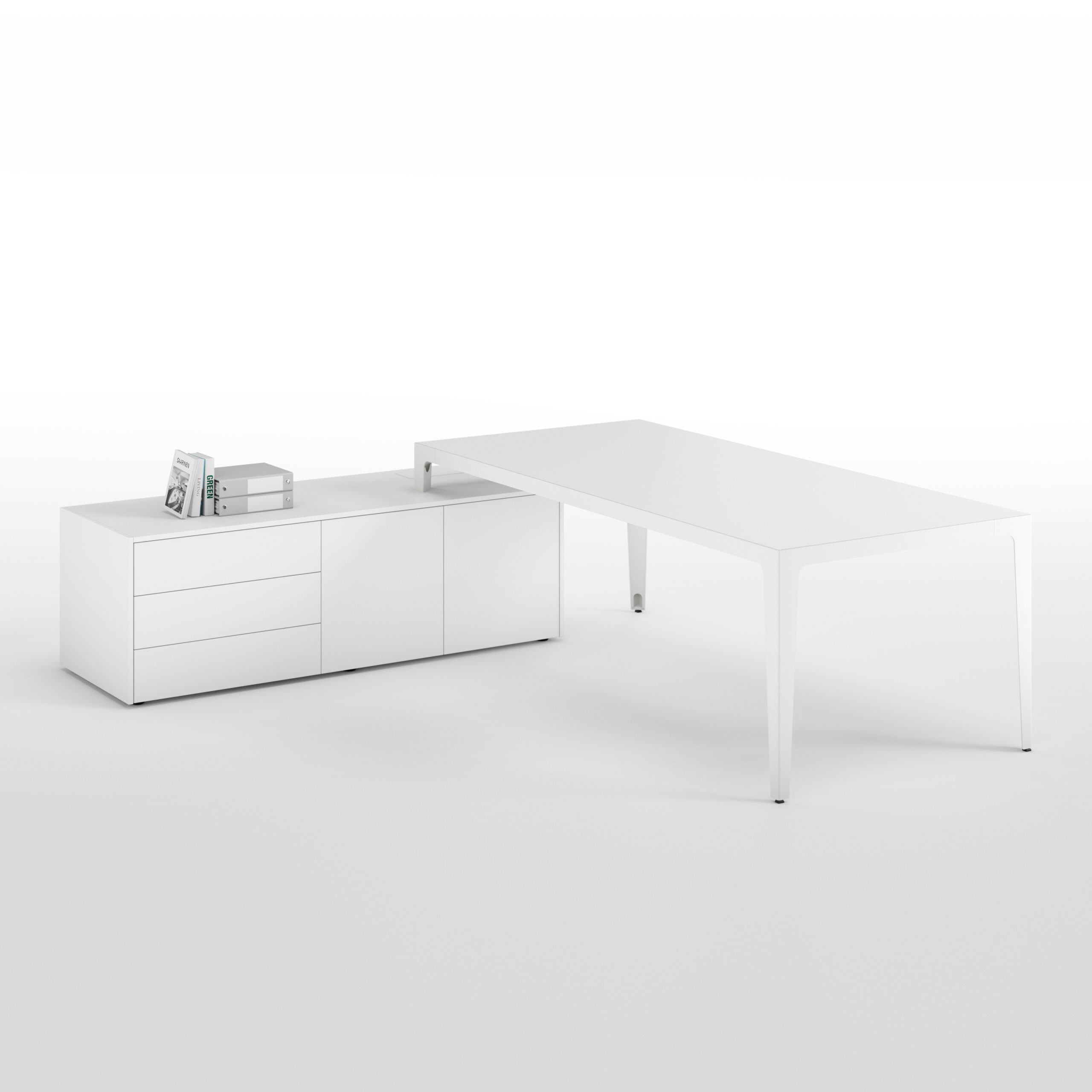 Modern and minimalist collection with flush-recessed top; glass, wood and gres combined with the coloured structures give energy to the working environment.