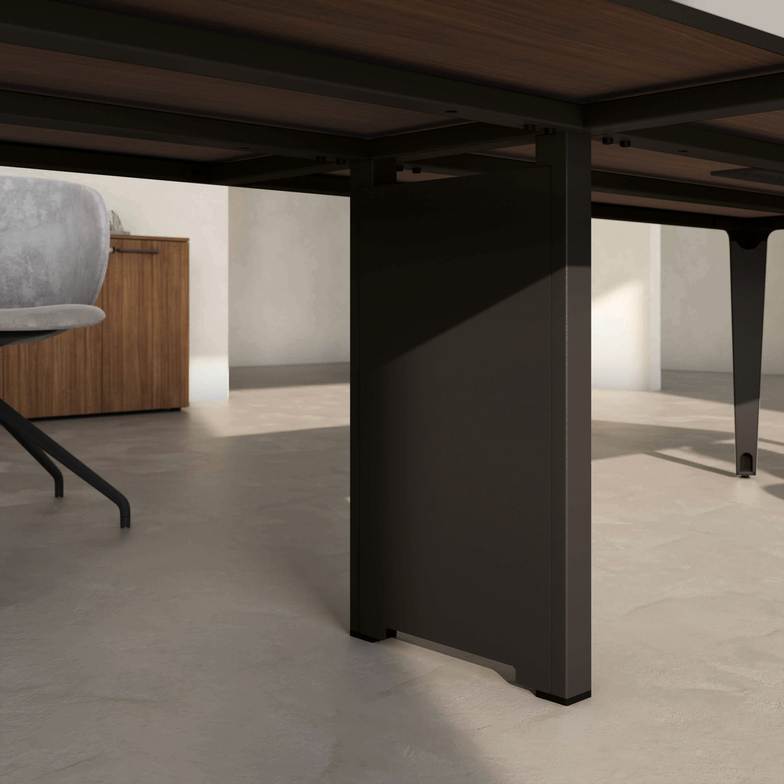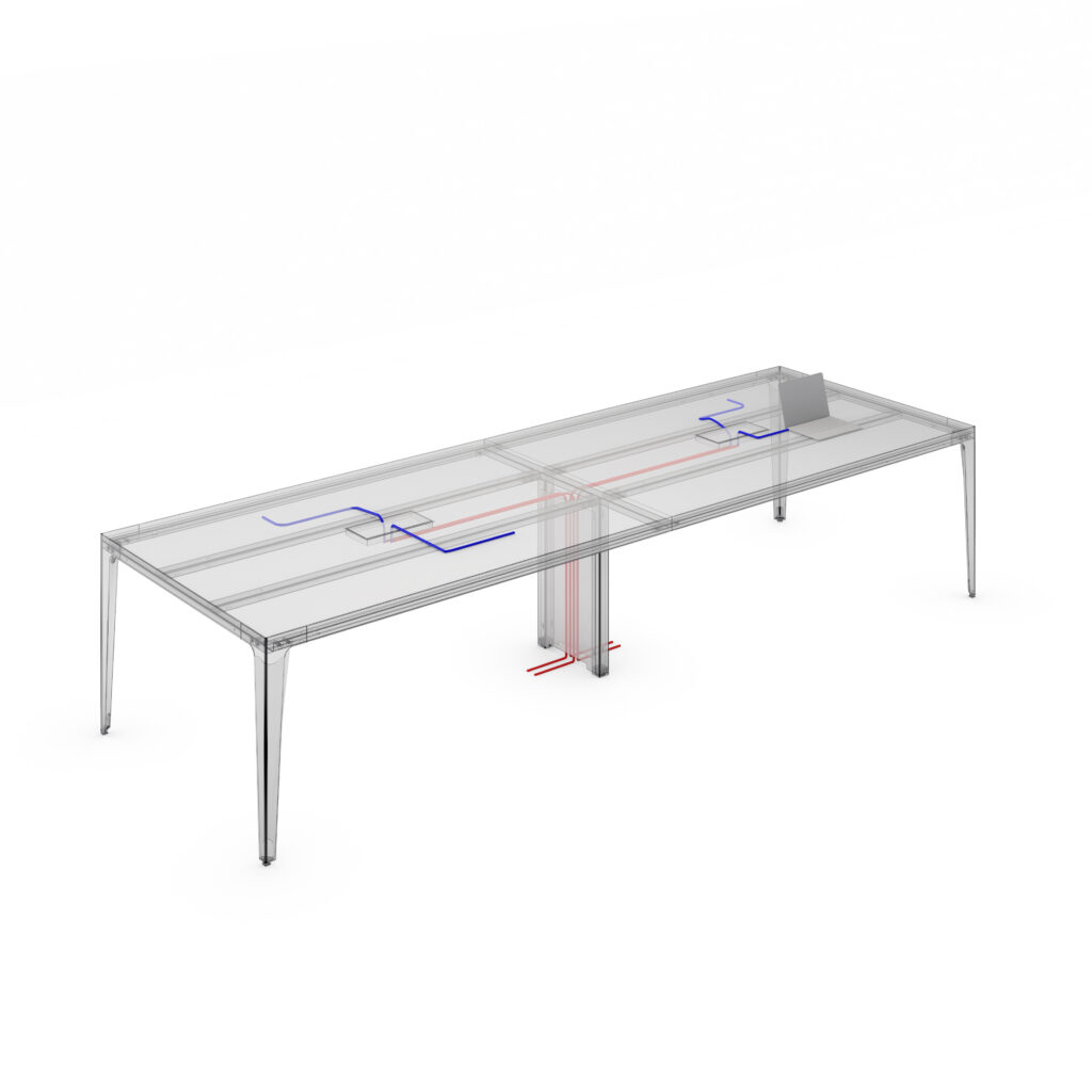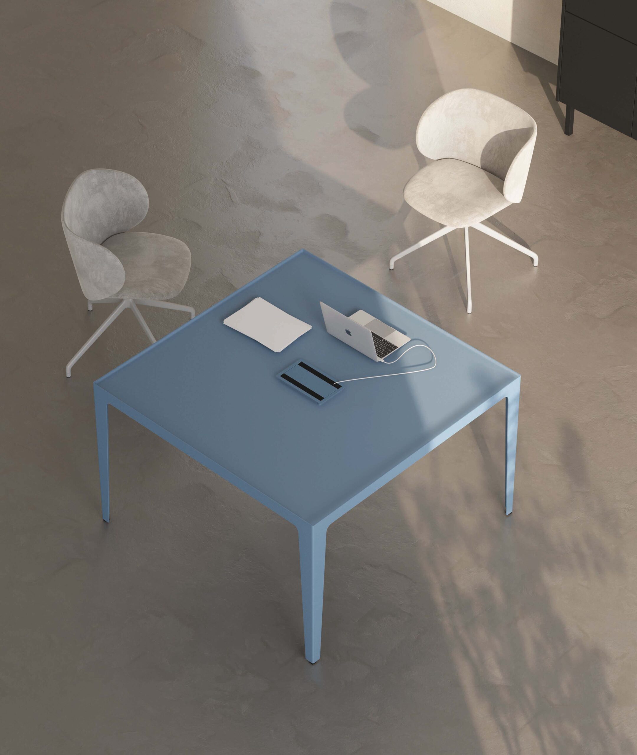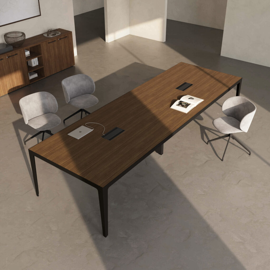 The meeting table is equipped with a central leg with removable metal panel that allows cables to climb to the top access.