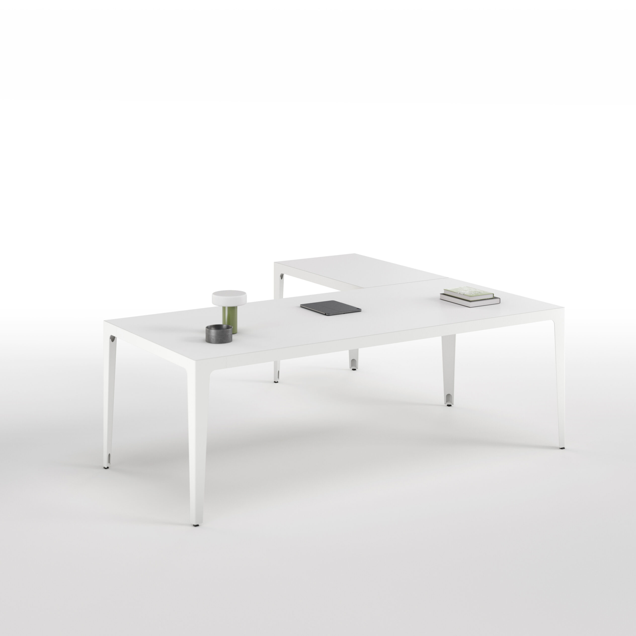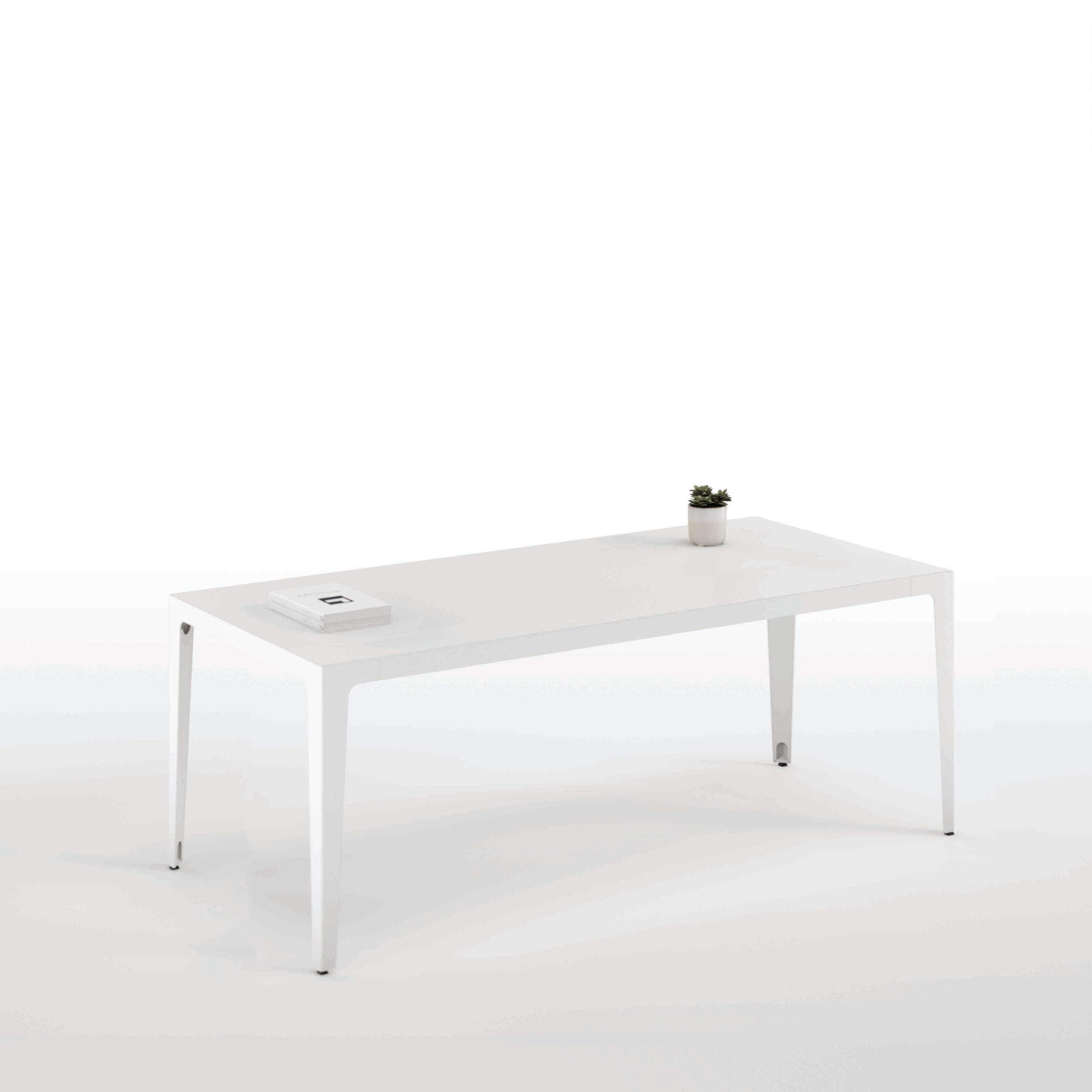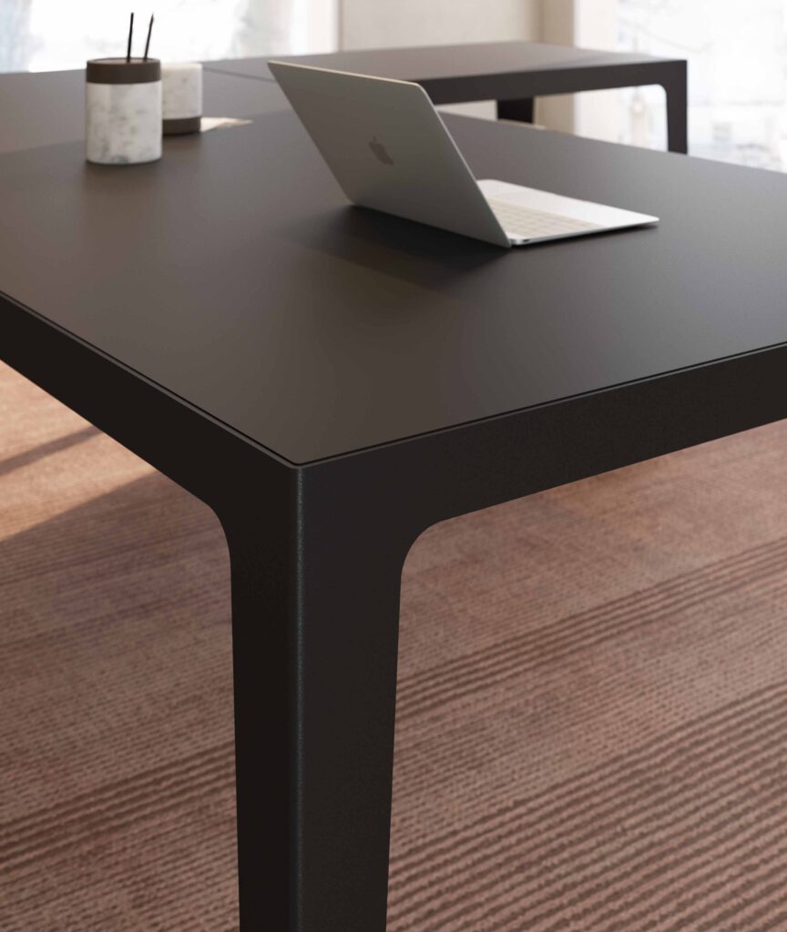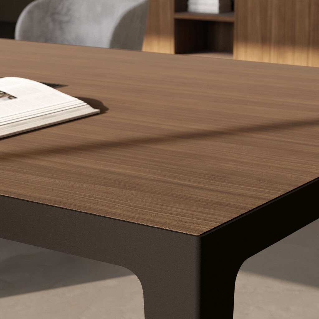 The meeting table is equipped with a central leg with removable metal panel that allows cables to climb to the top access.