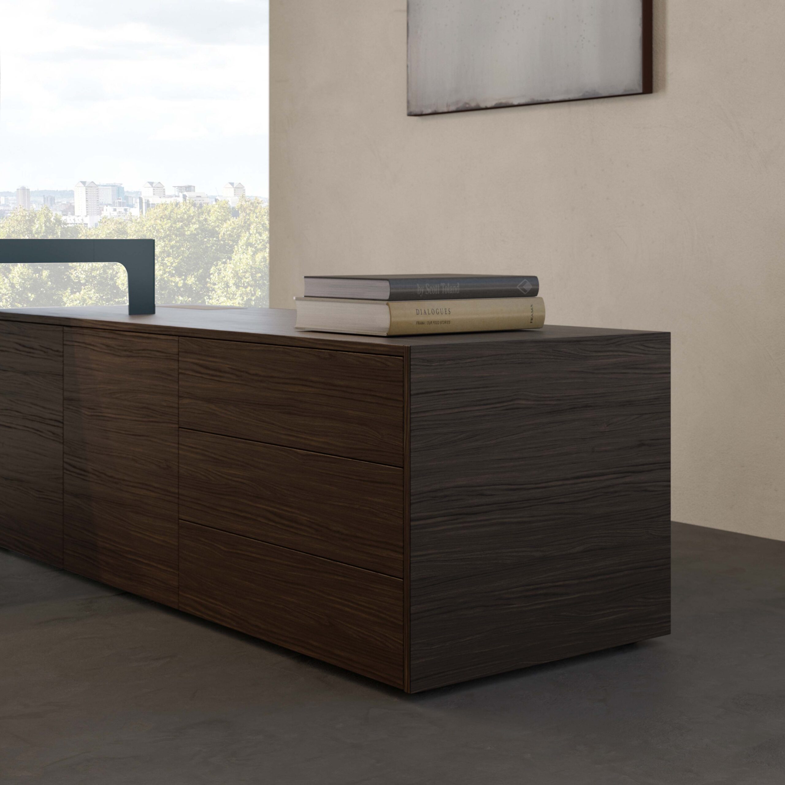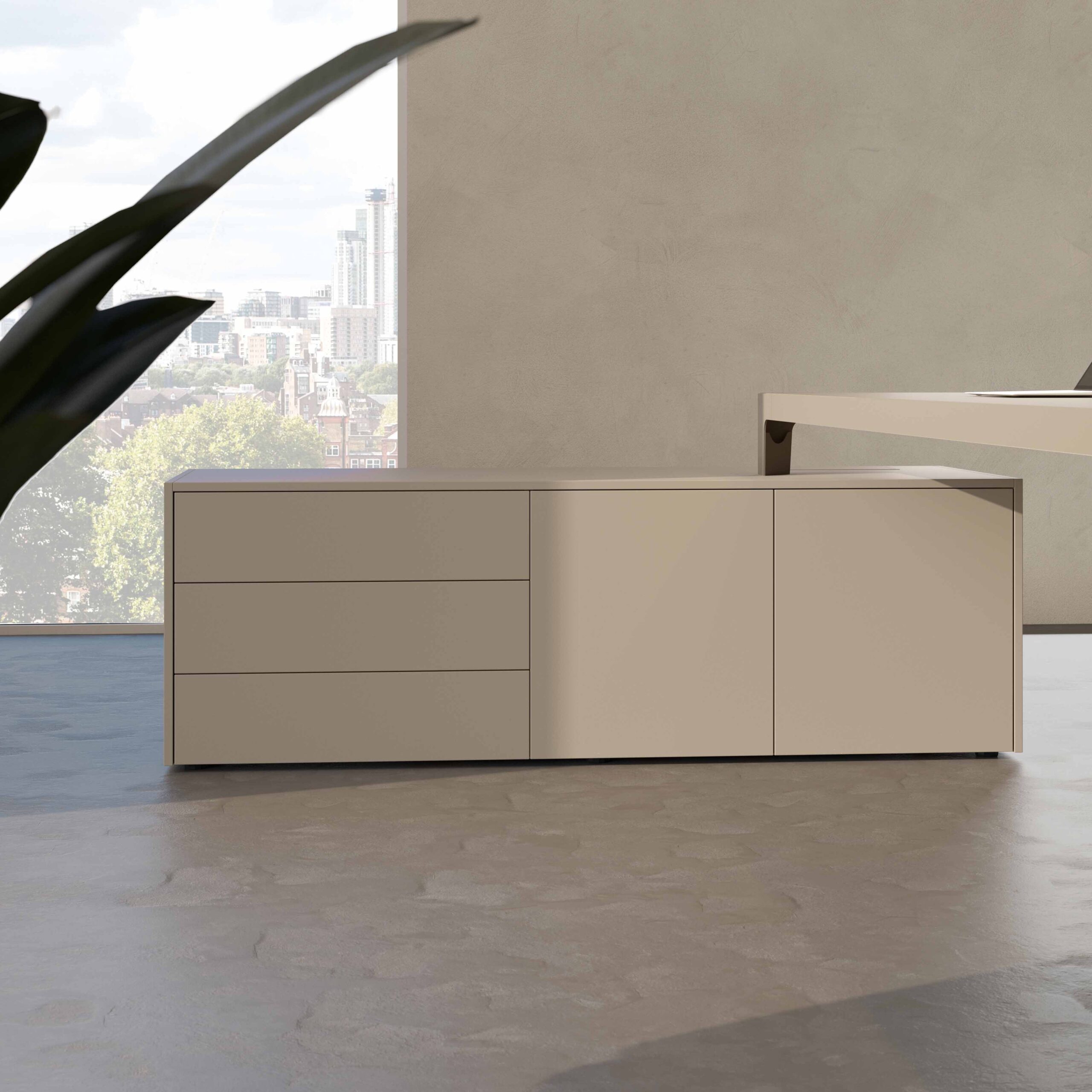Service unit with push-to-open doors; drawers with chipboard body and full-extension square guides, always with push-to-open opening.