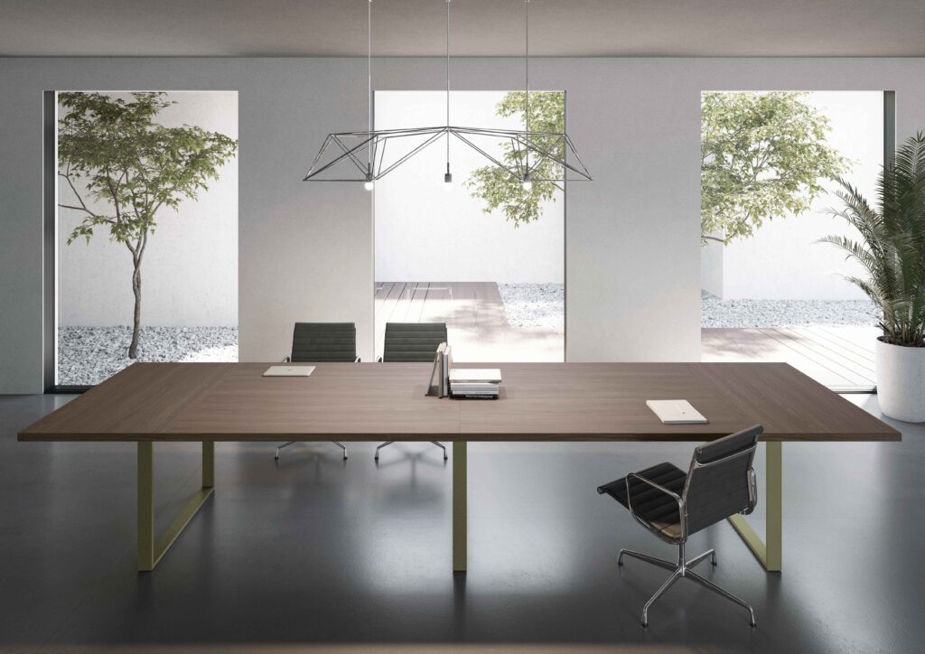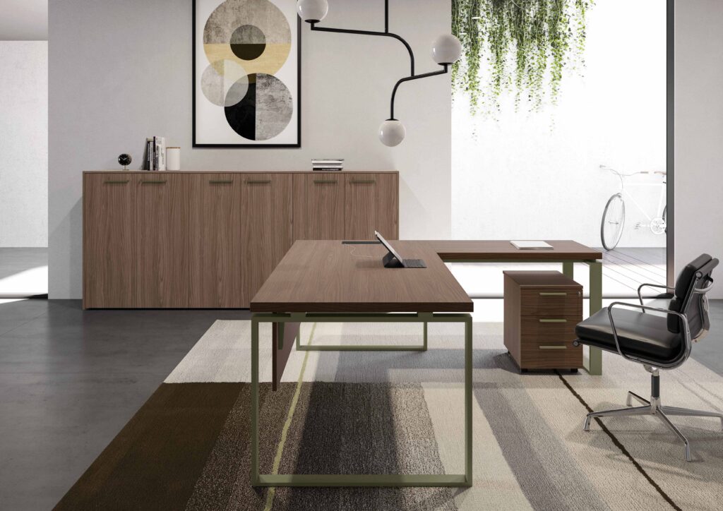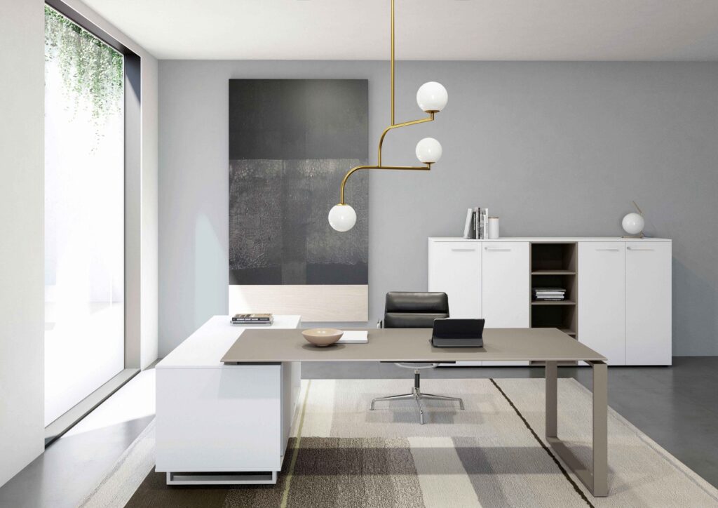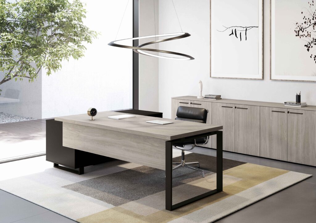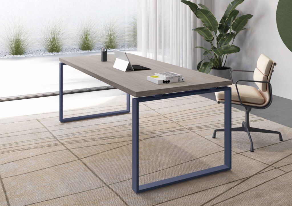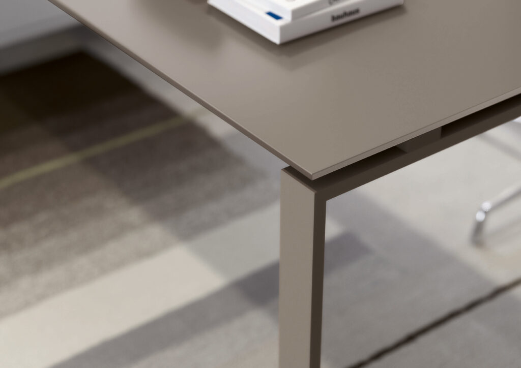 Collection de mobilier de direction caractérisée par des tables et des accessoires fonctionnels dans un seul système de construction.