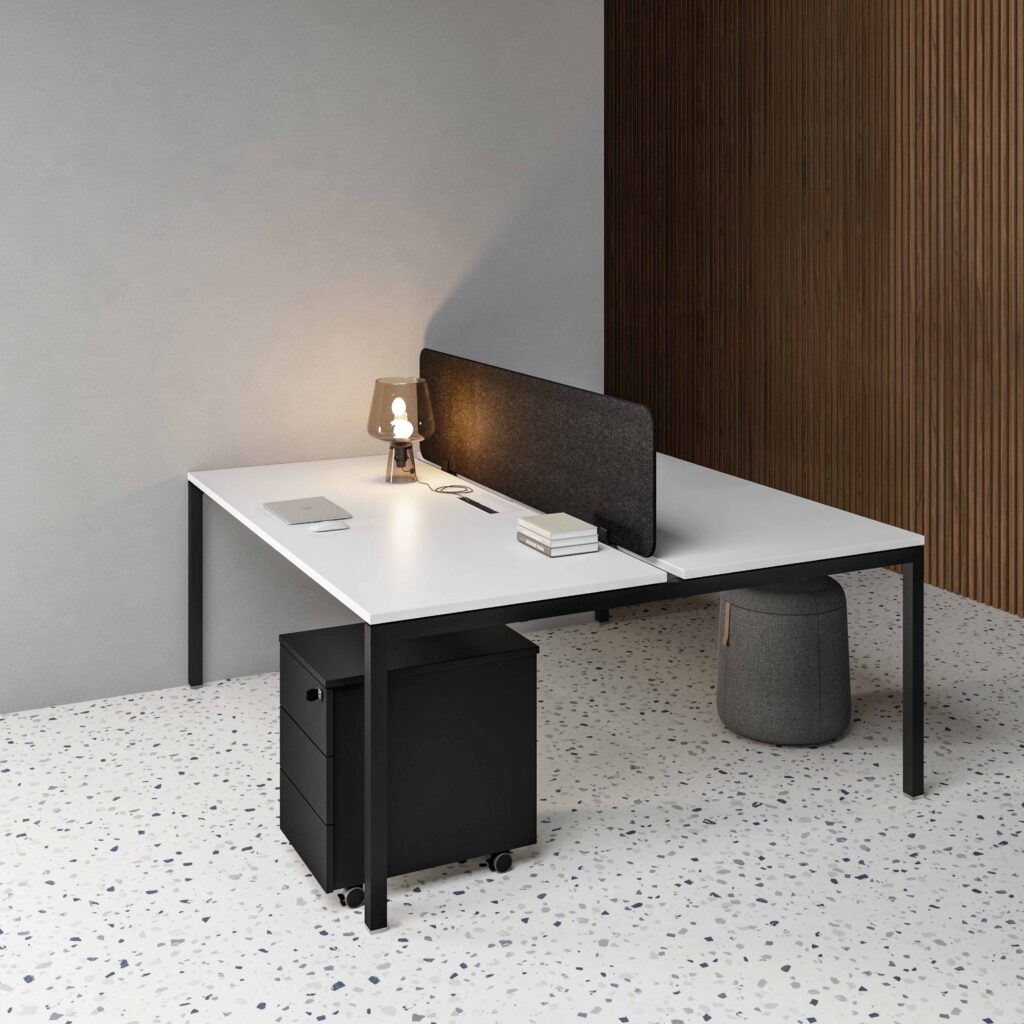 Forty_postes de travail bench: la fonctionnalité et l’esthétique garantissent des postes de travail multiples réalisés avec des matériaux techniques d’avant-garde tels que les écrans frontaux en PET qui garantissent l’absorption acoustiqe dans l’environnement_