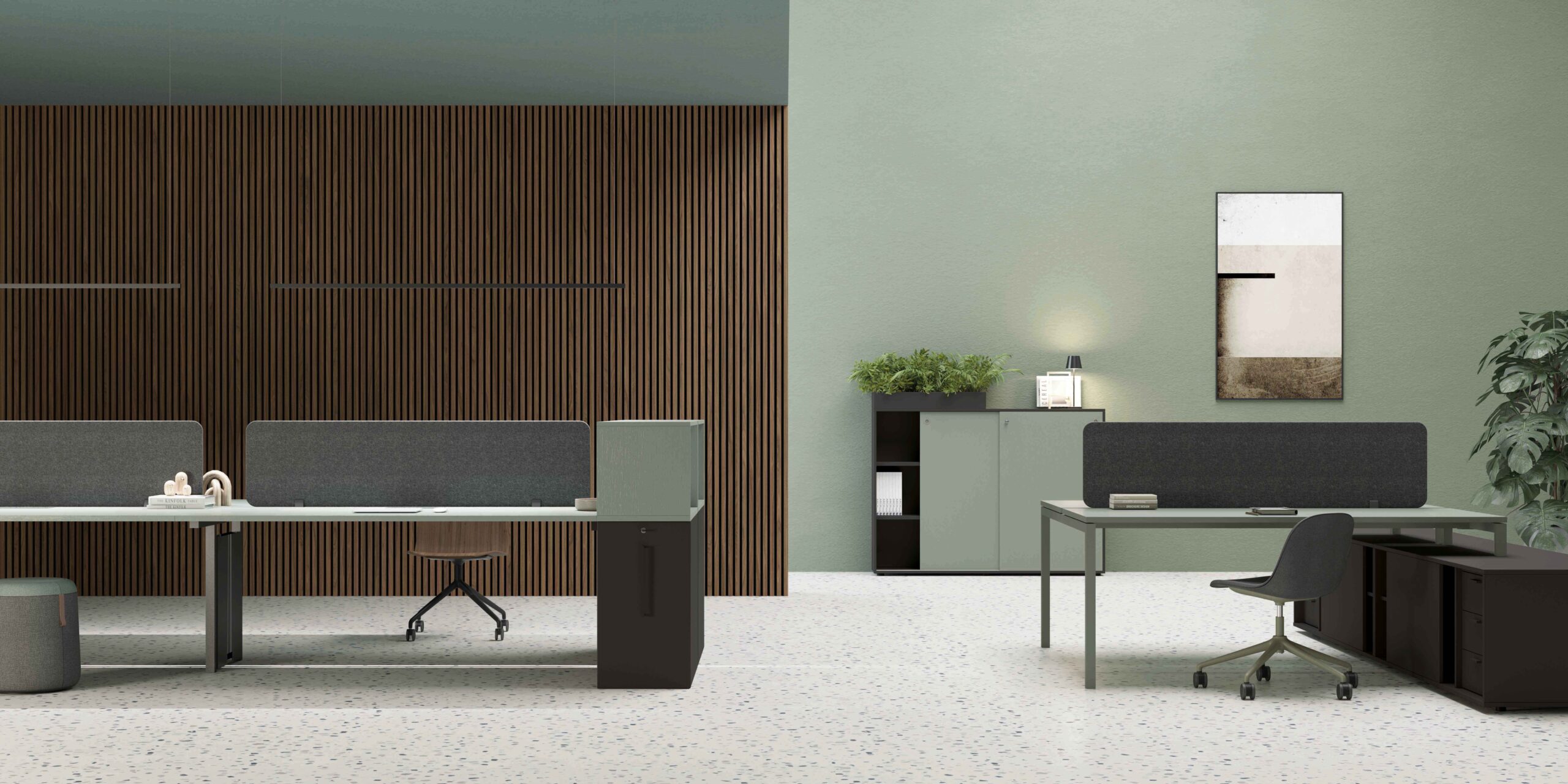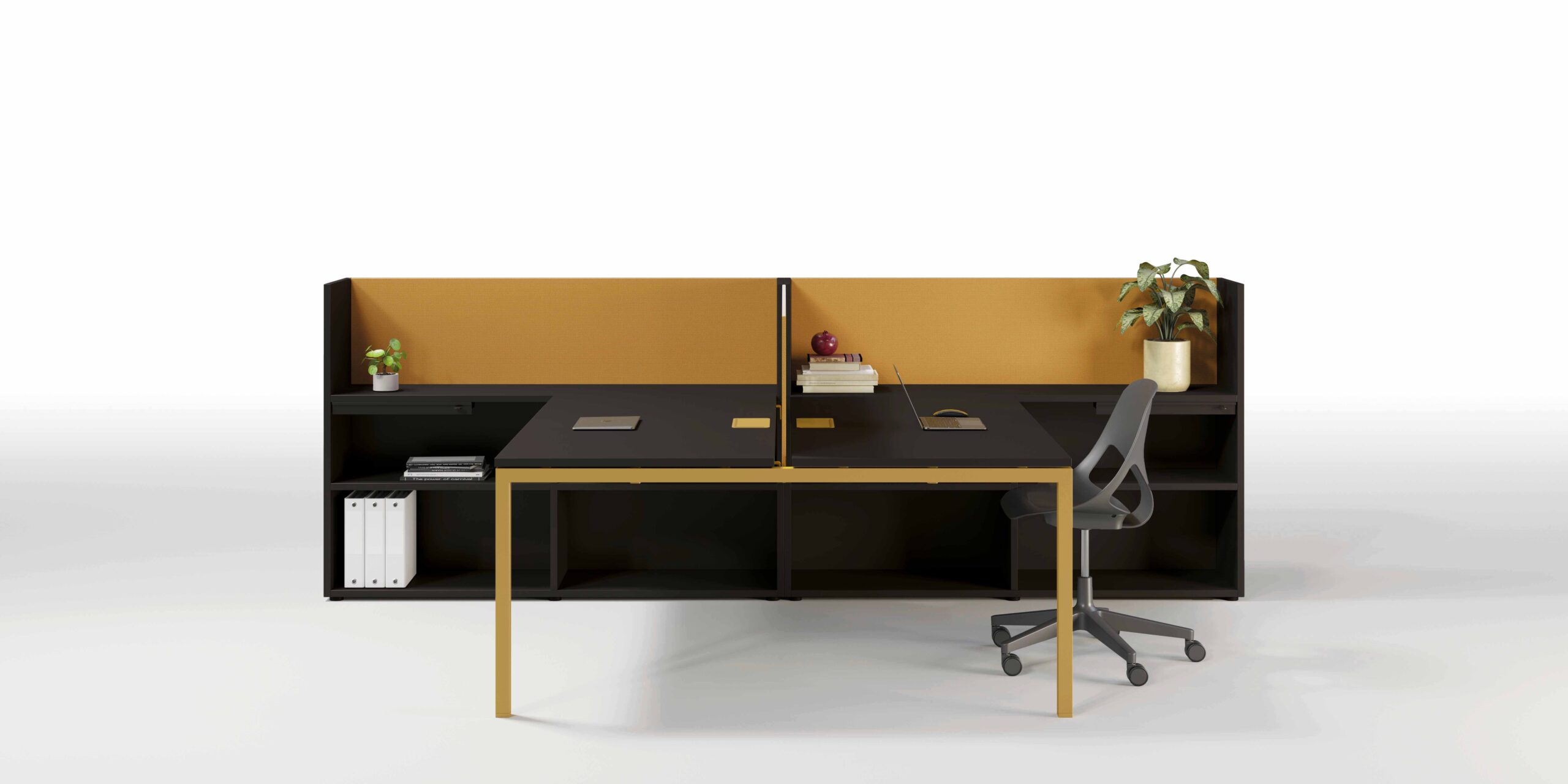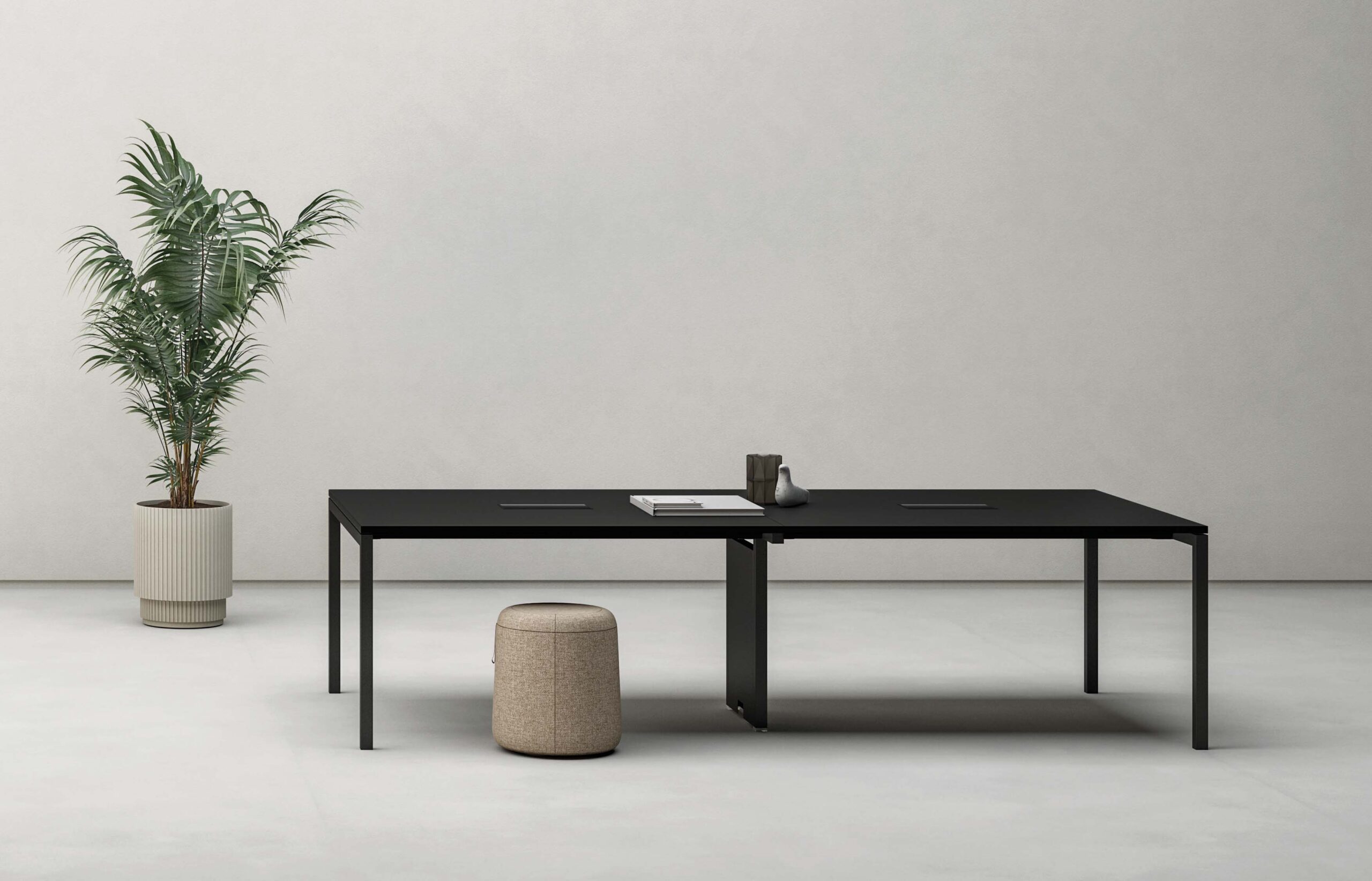 Forty_postes de travail bench: la fonctionnalité et l’esthétique garantissent des postes de travail multiples réalisés avec des matériaux techniques d’avant-garde tels que les écrans frontaux en PET qui garantissent l’absorption acoustiqe dans l’environnement_