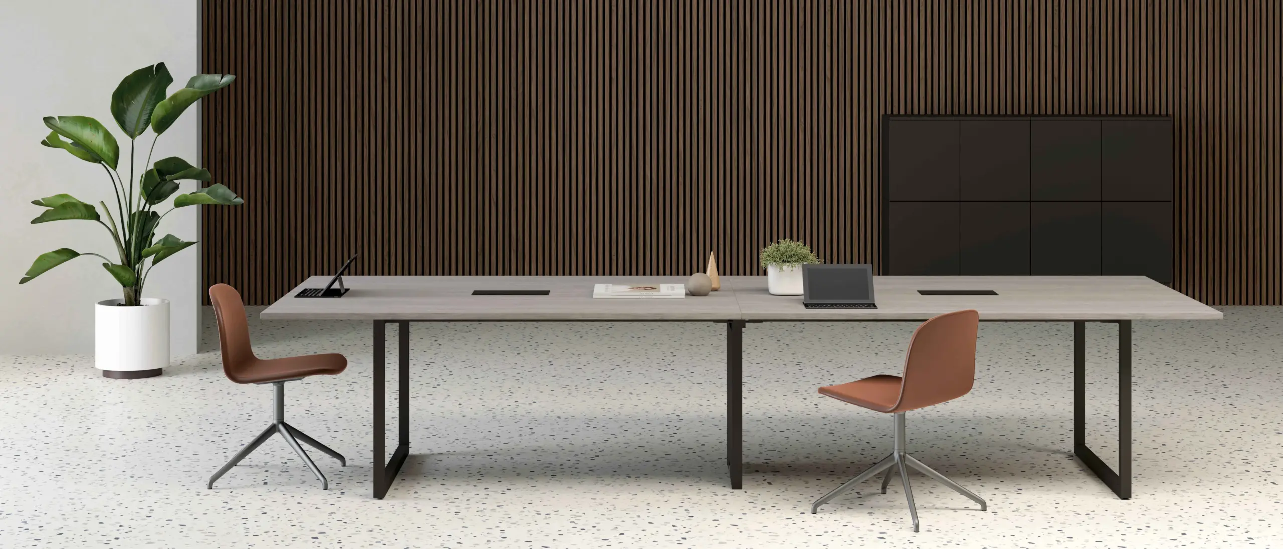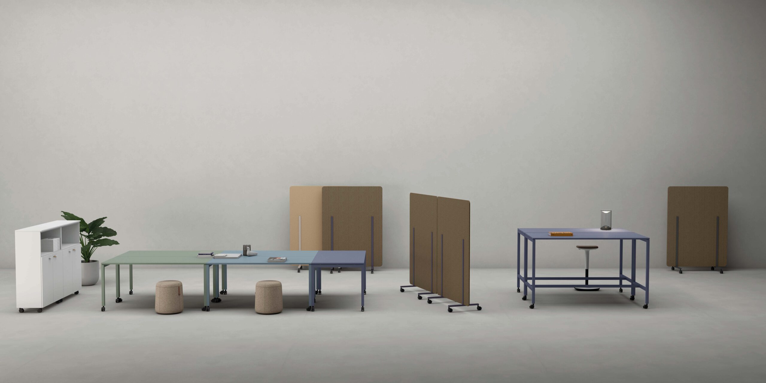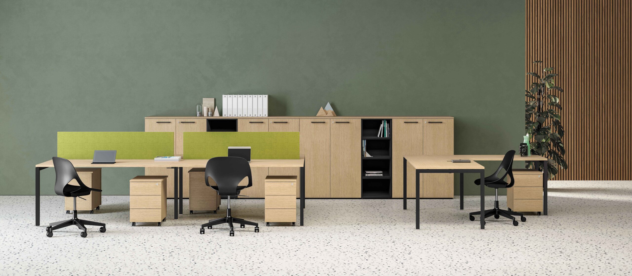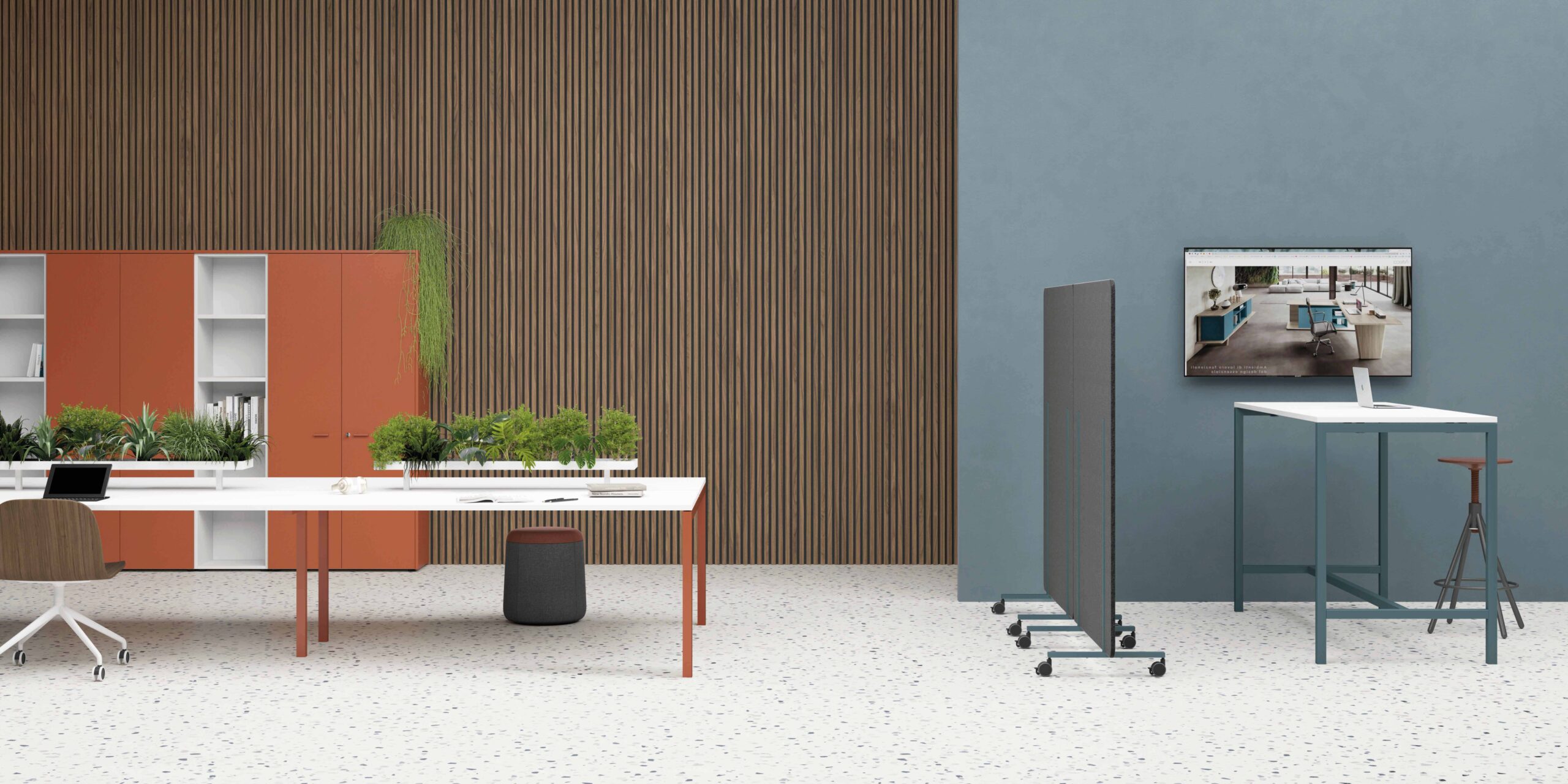 Forty_postes de travail bench: la fonctionnalité et l’esthétique garantissent des postes de travail multiples réalisés avec des matériaux techniques d’avant-garde tels que les écrans frontaux en PET qui garantissent l’absorption acoustiqe dans l’environnement_