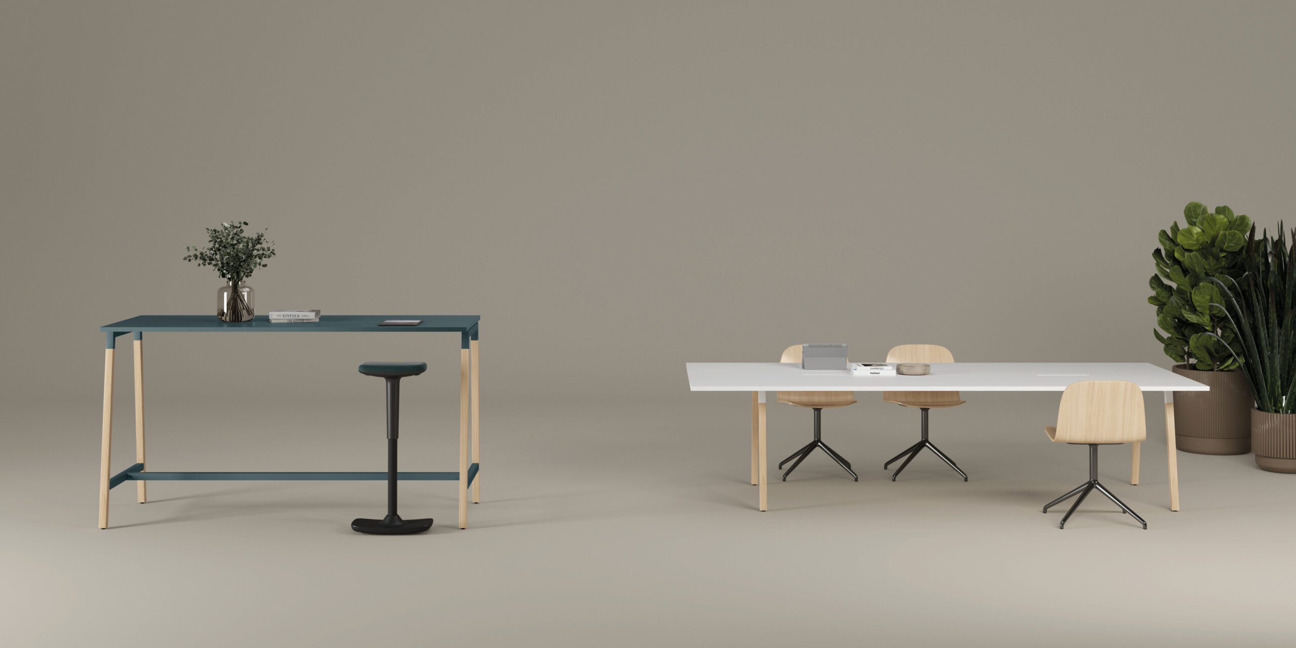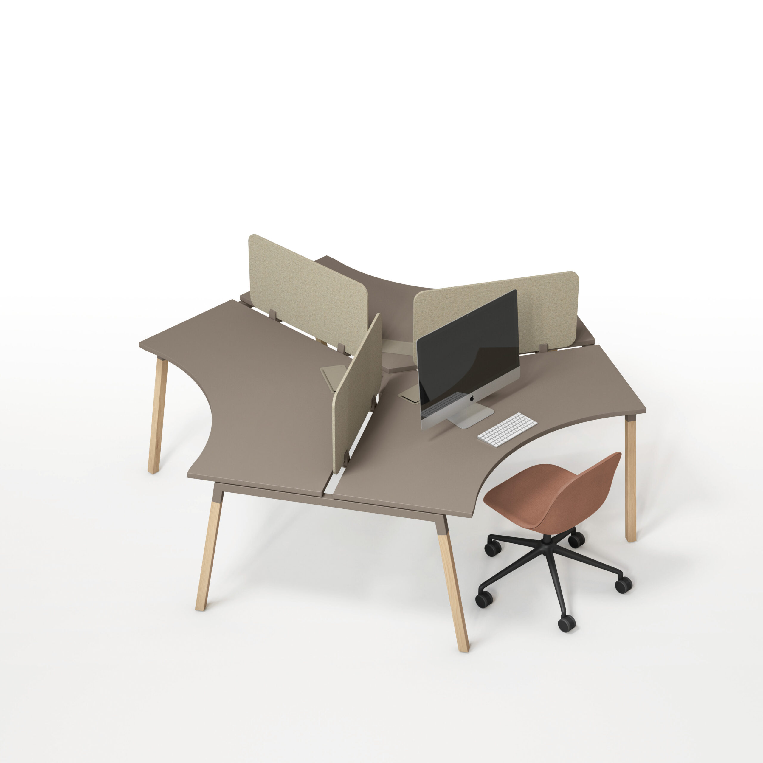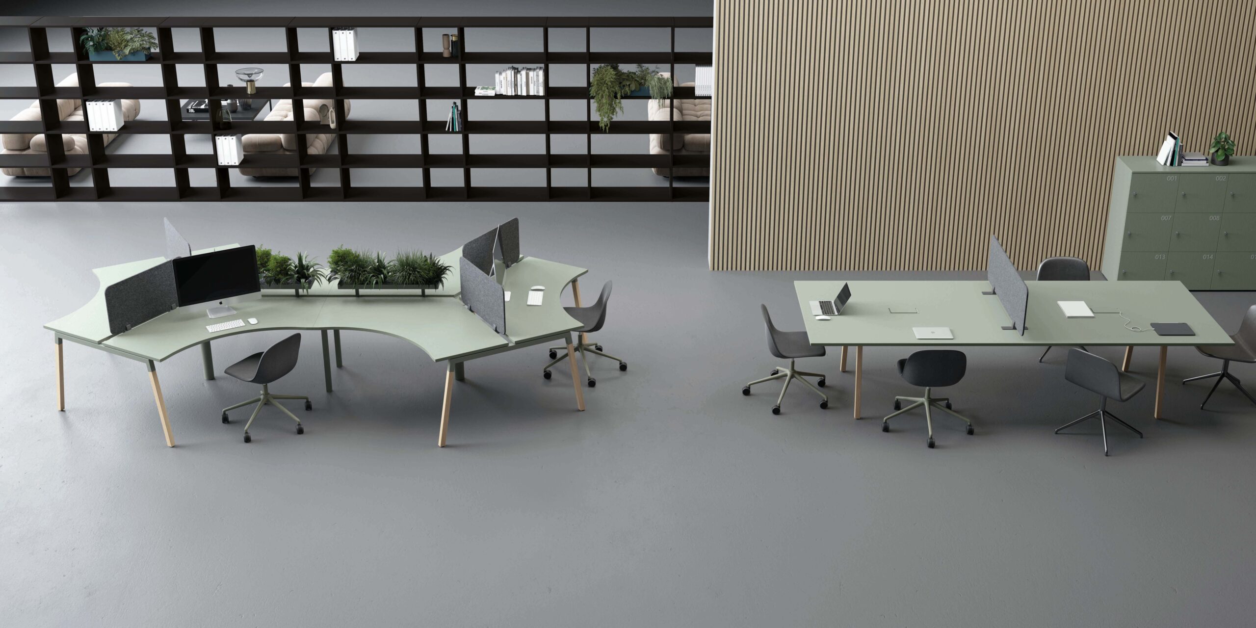 Postazioni a 120°, ideali per open space, con schermi frontali fonoassorbenti in PET.