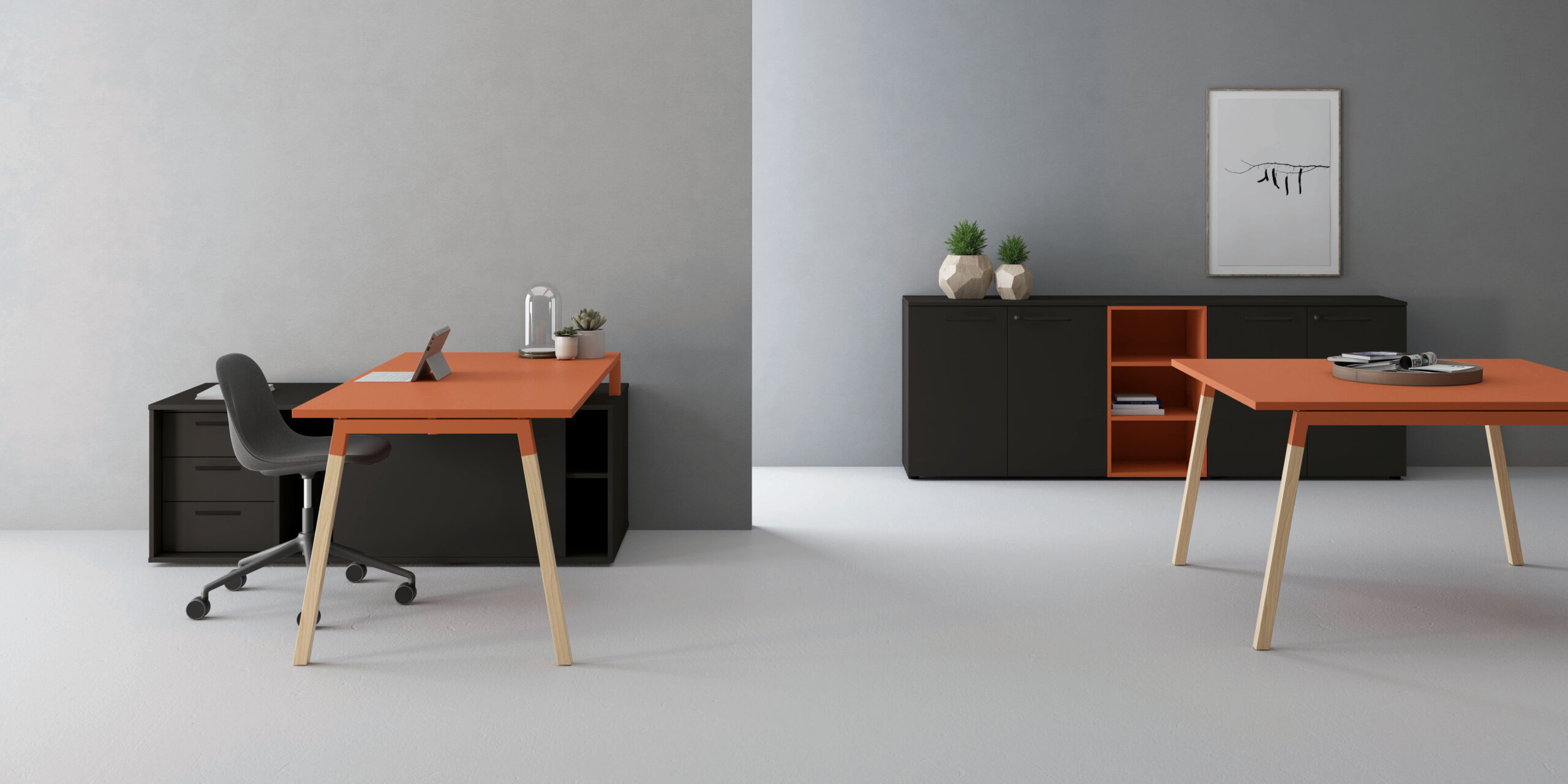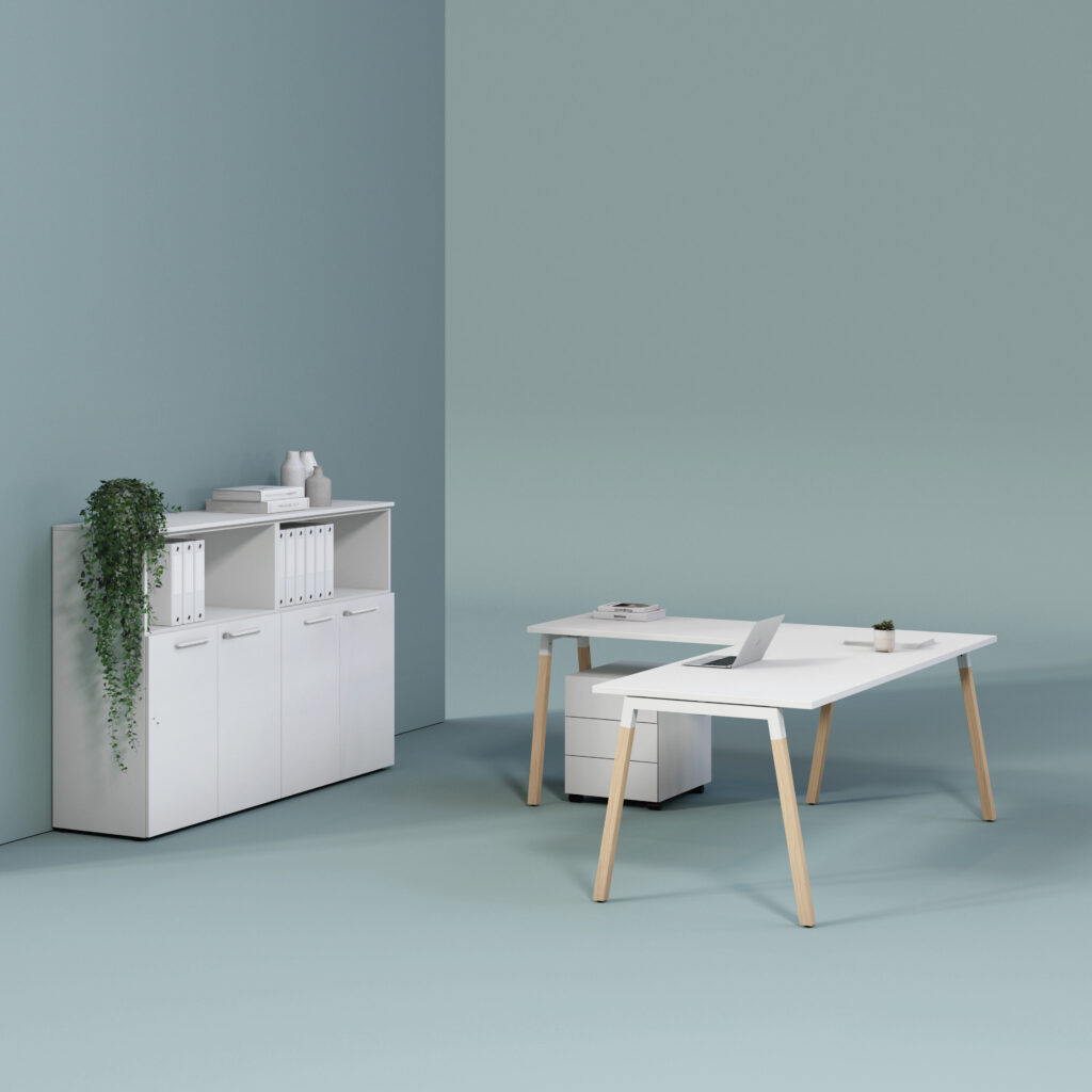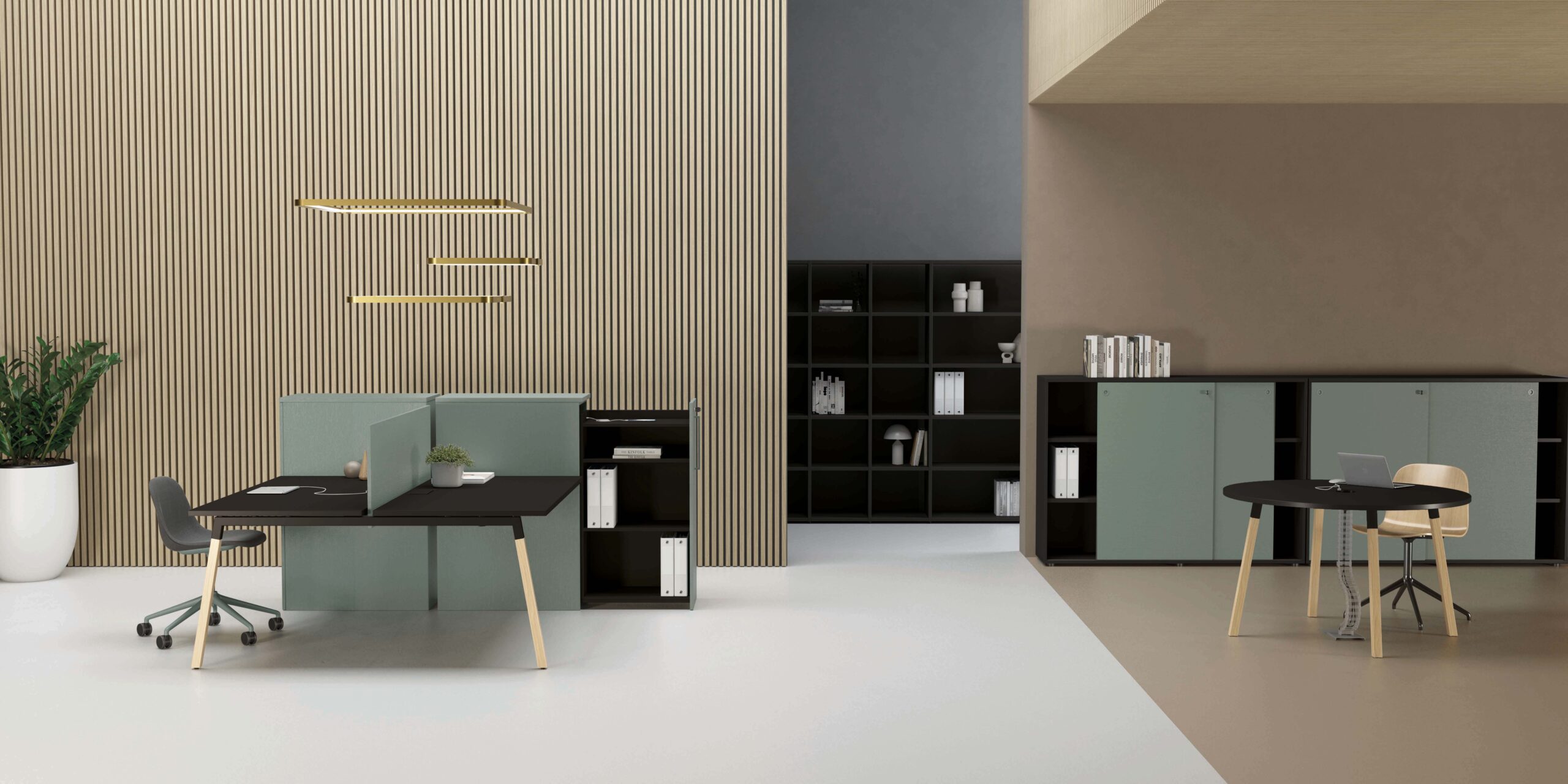 Manager office caratterizzato da elementi essenziali di contenimento e di cablaggio.